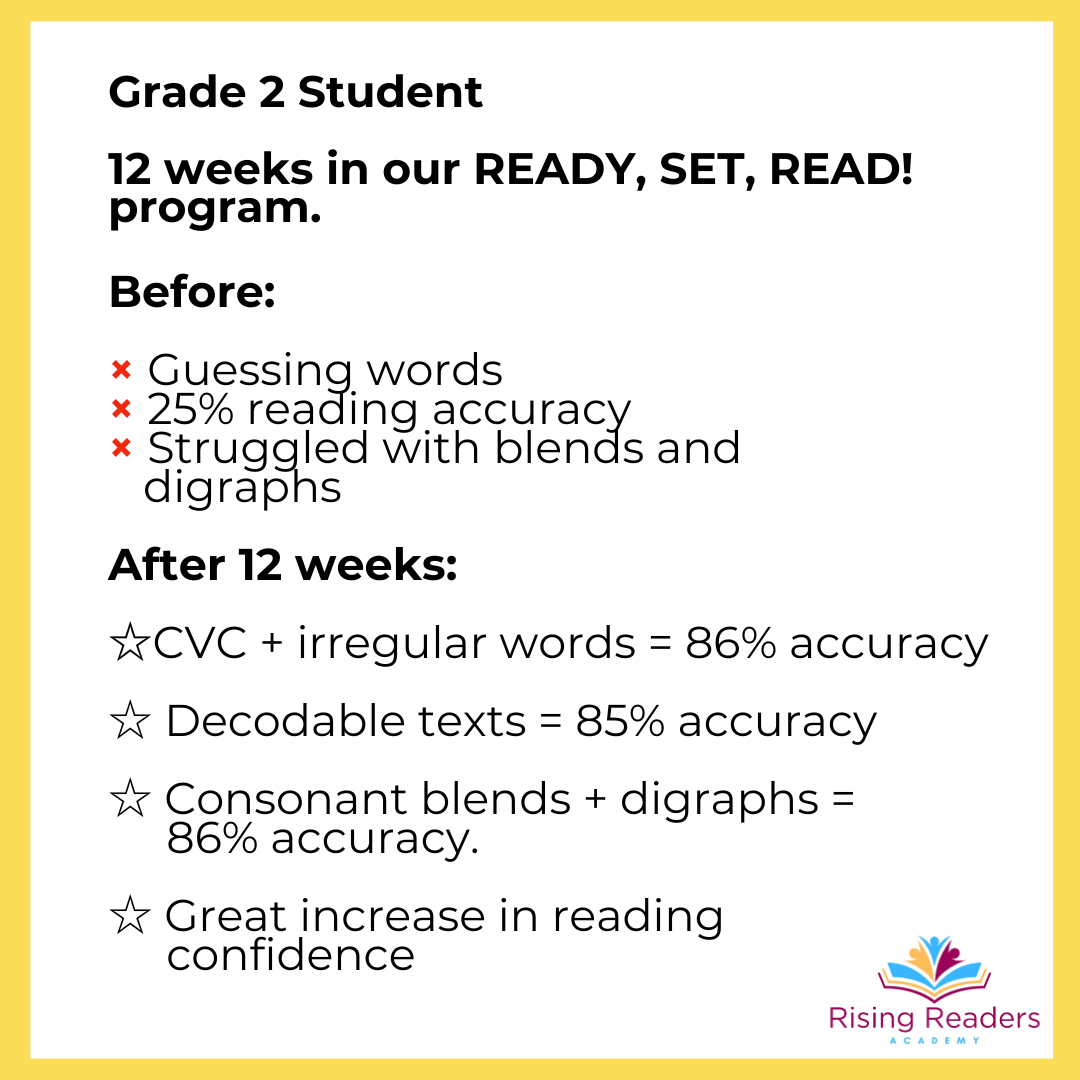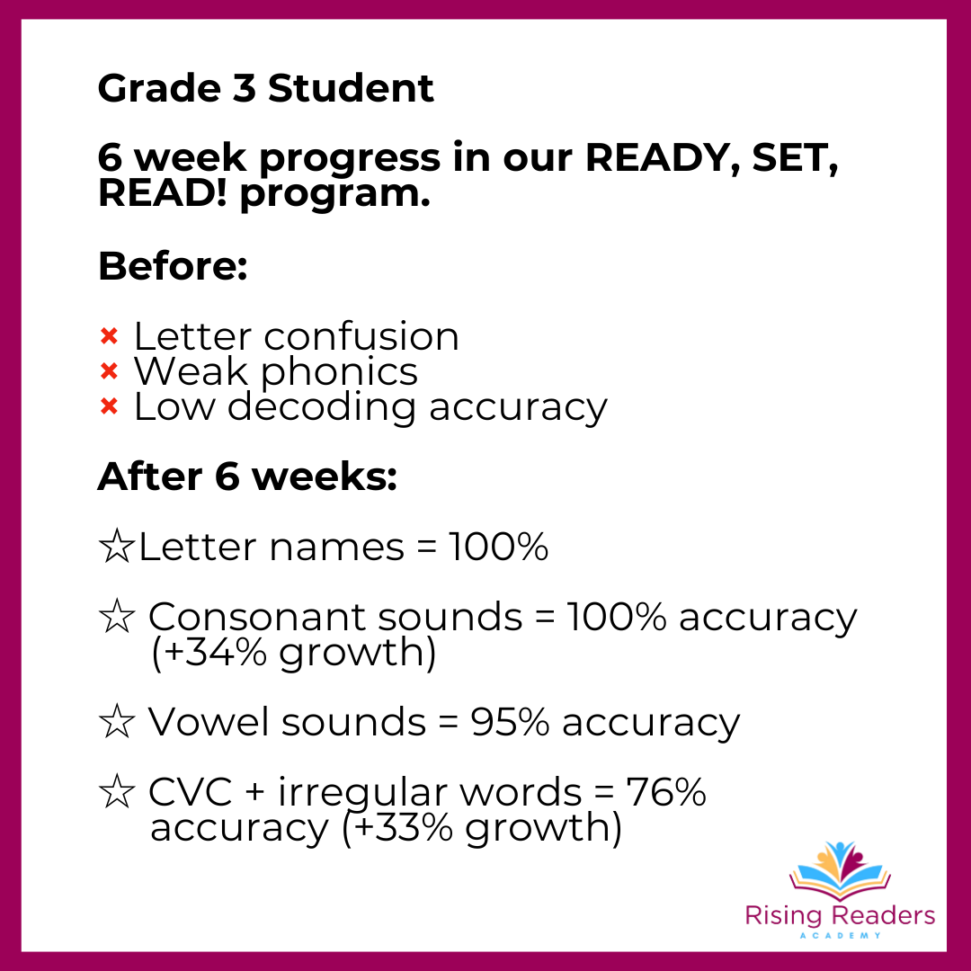 READY, SET, READ! is designed for children in Canada and the US in Grades 1–3 who are struggling to read at grade level. If your child often feels frustrated, embarrassed, or left behind in class, this program will help them catch up, gain confidence, and start enjoying school again.